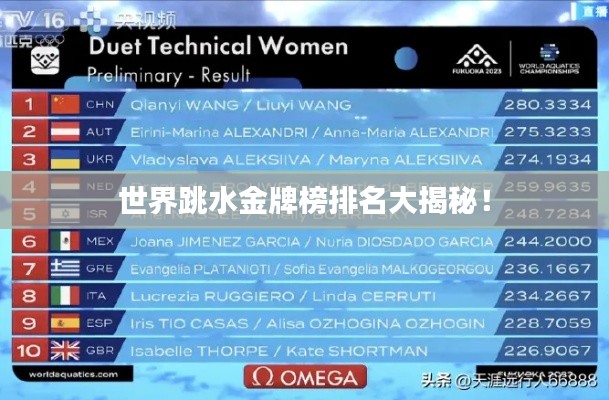 在世界跳水金牌排名中,中国、美国、英国等国家是领先的选手之一,中国跳水队在奥运会上的表现尤为出色,多次获得金牌荣誉,美国、俄罗斯等国家也在世界跳水领域拥有强大的实力,这些国家在选手培养、训练设施等方面投入了大量的精力和资源,为选手们在比赛中取得好成绩提供了有力的支持。